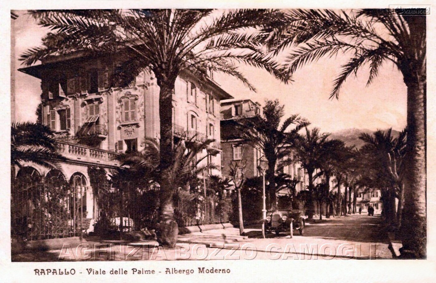 Viale delle Palme con la fila di alberghi allora tutti in esercizio. Al centro del viale una vettura "torpedo" in sosta. Oggi gli alberghi sono in disarmo, salvo l'ultimo (vedi scheda seguente). La via non ha pił le palme ed ha cambiato nome: si chiama Via Antonio Gramsci. |