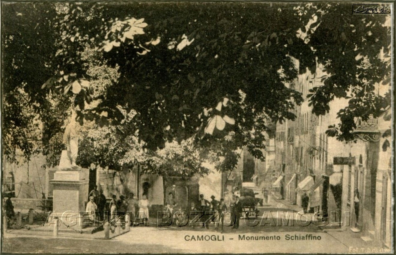 centro di aggregazione della città. Da notare il palazzo a sinistra che sporge dal filo della Via Vittorio Emanuele (ora Via della Repubblica) che restringeva la strada. Pochi anni dopo venne "tagliato" nella parte eccedente il filo dei palazzi adiacenti e così da rendere uniforme la larghezza della carreggiata in tutta la via. Il palazzo a destra di fronte al monumento a