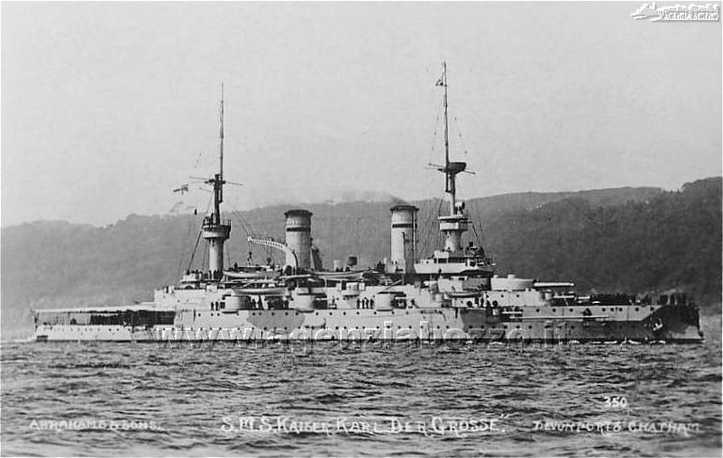Flotta. Il 31 agosto partecipò per la prima volta alle manovre estive nel Baltico, operazione che proseguì sino al 1908, quando venne assegnata alla II Divisione del I Squadrone della Flotta d'Alto Mare. Le unità della sua classe vennero rifatte tra il 1908 ed il 1910, mentre la Kaiser Karl der Grosse non fu ammodernata, nonostante dal 1910 entrarono in servizio i nuovi incrociatori che resero l'unità superata. Venne deciso di metterla nella riserva in parziale disarmo. Dal 1914 fu assegnata alla V Squadra della Riserva Navale insieme alle unità gemelle ed alla Wettin. Con lo scoppio della prima guerra mondiale l'unità venne rimessa in servizio attivo ed insieme alle gemelle formò la V Squadra della Flotta d'Alto Mare, con compiti di difesa costiera nel Baltico. Tuttavia nel febbraio 1915 vennero nuovamente ritirate e disarmate: Nel 1916 la Kaiser Karl der Große venne portata a Wilhelmshaven ed utilizzata come prigione. Il 6 dicembre 1919 l'unità venne radiata e venduta ai demolitori. Nel 1920 fu demolita a Rönnebeck. |