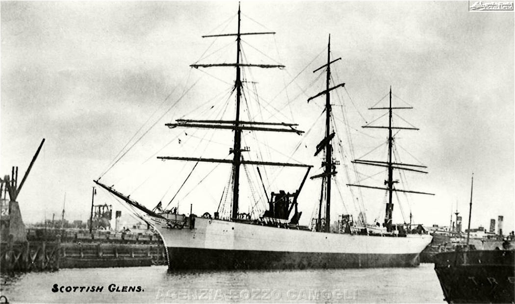 alla banchina in un porto sconosciuto. Varata nell'aprile 1885 dal cantiere Oswald Mordaunt & Co. di Southampton. Scafo in acciaio. Stazza 2059 tsl, 1969 tsn. Portata 3175 t. Lunghezza m. 85,20 Larghezza m. 12,30 Immersione m. 7,40 1885 Armatore W. H. Ross & Co., Liverpool. Capt. J. Fraser. 1898 Armatore G. Windram & Co., Liverpool. Capt. A. R. Johnson. 1910 Armatore A/S Scottish Glens (Chr. Nielsen & Co.), Larvik, Norvegia. Capt. R. Lonnergan 1910. Capt. Andersen 1912. Capt. A.F.T. Hansen 1914. 19-- Armatore Console Sigvart Rasmussen, Haugesund (Norvegia). 1917 Armatore S. Ugelstad, Brevik, Norvegia. Capt. C.A. Danielsen. 1918 Armatore A/S Dovrefjell (Olsen & Ugelstad mgrs), Christiania, Norvegia Capt. C.A. Danielsen. Nel 1918 perse l'alberatura in una tempesta. Nel 1919 fu danneggiata in porto e portata in cantiere alle riparazioni. 1923 Armatore Sigvart Rasmussen, Haugesund, Norvegia. Ribattezzata Haugar. Installata luce elettrica e stazione radio a bordo. Convertita in motonave. Due eliche. Montate 2 motrici diesel 2SCS A 8 cil. da 14,3/16"-20,7/8" 282HP costr. 1922 ditta A/B Atlas Diesel, Stockholm montate nelle Officine Werke A/G, Stettino. Capt. T. Tönnesen. 1929 Armatore Leif Brjde, Sandefjord, Norvegia. Convertita in nave officina baleniera a Sandefjord. Adibita alla caccia alle balene in Antartico. 1933 Armatore Hvalfangerslsk Ishavet A/S (Leif Bryde mgr.), Sandefjord, Norvegia. Stive adattate per caricare olio di balena in bulk. 1934 Armatore Hvalfangerslsk Haugar A/S (Anthon Ingebrigtsen), Oslo. 1936 Dal 1939 O.A. Halversen manager. 1940 Armatore Leonardo Arrivabene S. A. (Leo Salom) di Venezia. Trasformata in cisterna ed adibita al trasporto di combustibile. Ribattezzata Arca. Il 26 ottobre 1942, mentre era in navigazione nel Mar Egeo a 9 miglia a sud dell'isola di Chio venne affondata dal sommergibile britannico HMS Taku. |
