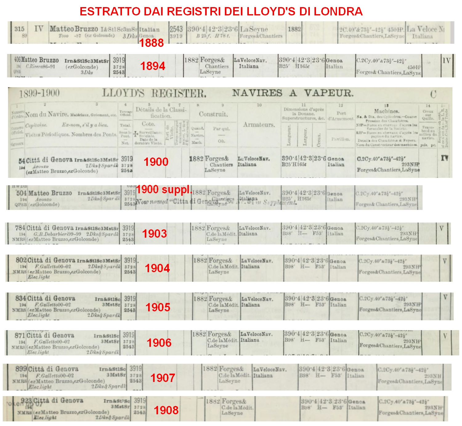 1922: una stella rossa a 5 punte in campo giallo ocra). Venne costruita nel 1882 dal cantiere Forges et Chantiers de la Seyne (Baia di Tolone). Varata nel novembre 1882. Stazza 3919 tsl, 2543 tsn. Lunghezza m. 128. Larghezza m. 12,89. Immersione m. 7,17. Propulsione: 1 motrice compound a 2 tempi 2 cilindri Ø 1015 & 1855 x corsa 1070 mm. Potenza 450 HP. Velocità 13 nodi. Costruzione Forges et Chantiers de la Seyne. Trasportava 32 passeggeri di prima classe, 20 di seconda e 1244 in terza. Armatori: 1883 Compagnie Fraissinet, Marsiglia. Porto di Registro Marsiglia, Francia. Nome Golconde. Bandiera francese. Venne impiegata nella linea Marsiglia - Hong Kong - Shangai e ritorno. Dopo quattro viaggi, rivelatisi antieconomici, la nave venne rivenduta. 1884 Compagnia di Navigazione Matteo Bruzzo & Co. Genova. Compartimento di Genova. Bandiera italiana. Le venne dato il nome del suo fondatore Matteo Bruzzo, morto tre anni prima. Fu il sesto ed ultimo acquisto di questa Compagnia. Fu immessa in servizio sulla rotta Genova - Sud America. 1884 Nello stesso anno la proprietà passa alla Navigazione Italiana a Vapore La Veloce, appena costituita, proseguendo per la stessa rotta. Nell'ottobre 1884 è posta in quarantena per pericolo di colera a bordo. 1899 Stesso armatore, la nave è ribattezzata Città di Genova per evitare omonimia con altra unità. Continuò i viaggi del Sud America con qualche viaggio a Boston e New York. Nel 1902 compie l'ultimo viaggio per New York, continuando sino al 1906 sulle rotte sudamericane. 1907 Inviata alla demolizione. |