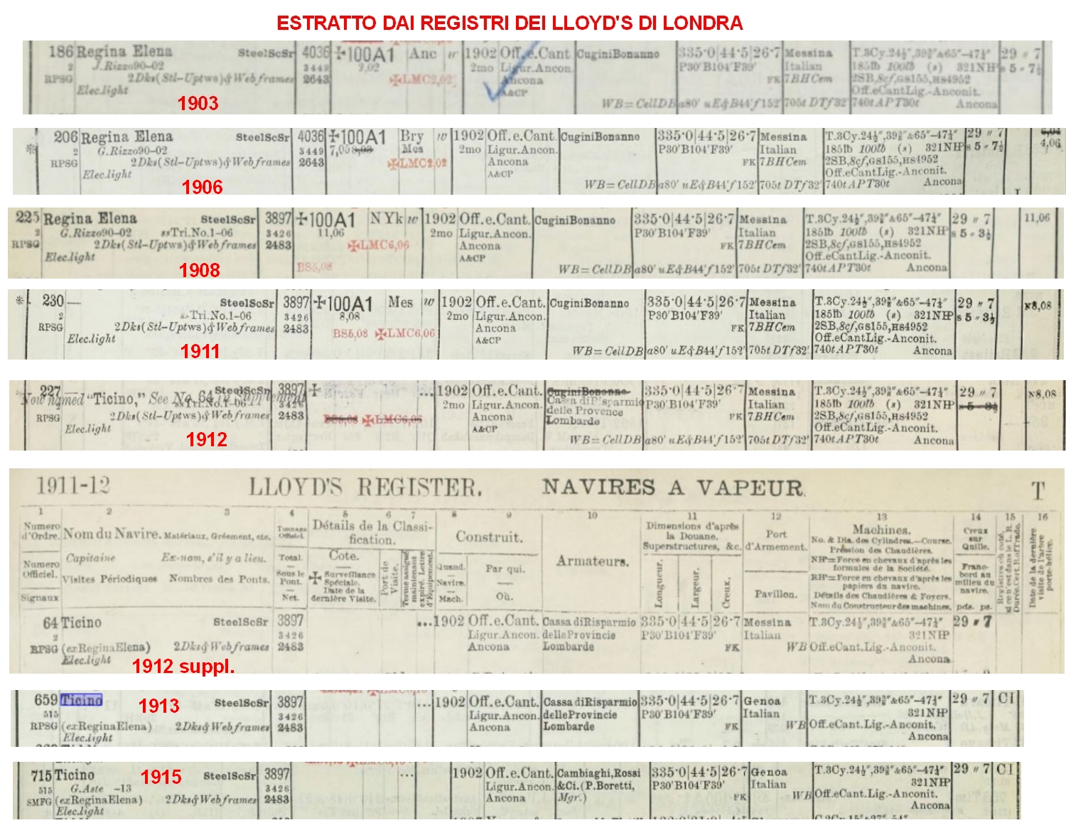 al momento del varo. Venne costruito dalle Officine e Cantieri Liguri - Anconitani, Ancona. Numero 2 di cantiere. Consegnato nel 1902 come n° 3. Impostato nel febbraio 1901. Varato l' 11 novembre 1901. Scafo in acciaio. Stazza 4036 tsl, 2643 tsn. Portata lorda 6.100 t. Lunghezza 122,11 m. Larghezza 13,58 m. Immersione 8,10 m. Due ponti e ponte di coperta in acciaio. Provvisto di compartimenti stagni. Dotato di corrente elettrica. Propulsione: 1 motrice a vapore a triplice espansione, 3 cilindri 610, 990 & 1650 x corsa 1195 mm. Potenza 2225 HP, 321 HP nominali. Velocità 10,5 nodi. Costruzione Officine e Cantieri Liguri - Anconitani, Ancona. 1 asse / 1 elica. Armatori: 1902 Cugini Bonanno, Messina. Porto di armamento Messina. Nome Regina Elena. Bandiera italiana. Capt. G. Rizzo 1902-1907. 1911 Cassa di Risparmio delle Provincie Lombarde, Milano. Porto di armamento Genova. Nome Ticino. Bandiera italiana. 1914 Cambiaghi, Rossi & C. (P. Boretti manager), Genova. Porto di armamento Genova. Nome Ticino. Bandiera italiana. 1915 Il 6 novembre, a 12 miglia da Cap de Fer (Skikda, Algeria) venne affondato a cannonate dal sommergibile tedesco U-38 al comando del Cap. Max Valentiner. Altre immagini del mercantile Regina Elena alle schede N° 999B, N° 1000B, N° 1001B, N° 1002B. |